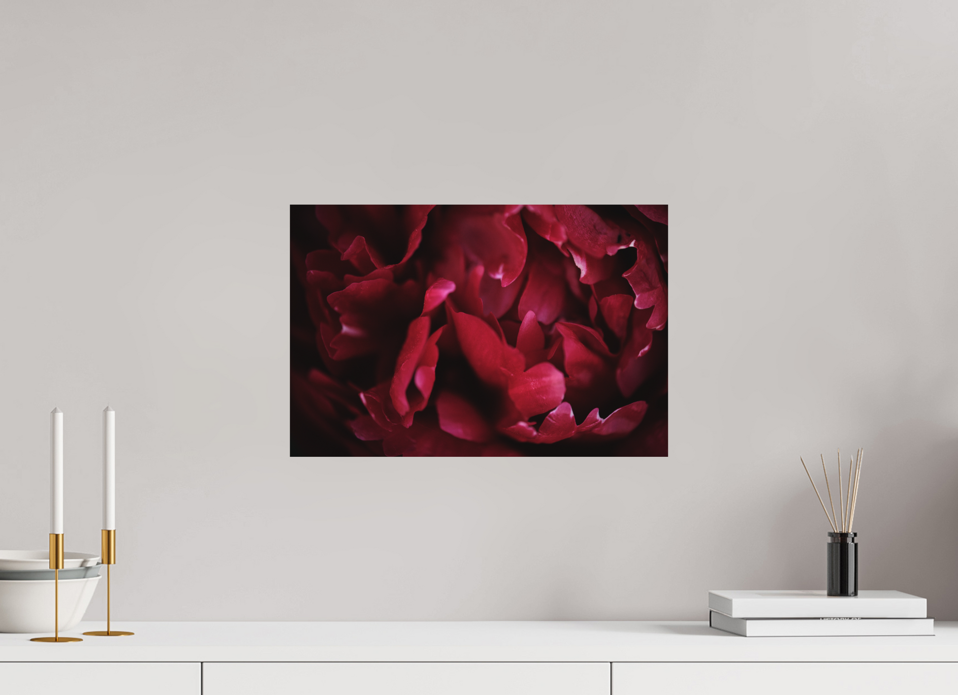 Een pioenroos is mooi in de tuin, maar ze misstaat ook niet aan de muur. Dit prachtig dieprode exemplaar is een ware eye-catcher in elk interieur.